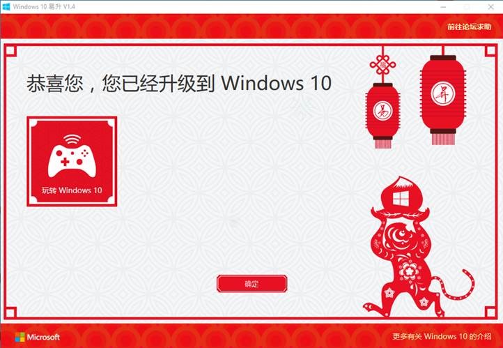 b. 将专属“易升”软件下载到PC后,通过QQ、网盘、微云、邮件等多种方式,将易升软件发送并分享给其他人。被推荐者,打开该“易升”软件,即可按照工作顺序,进行Windows 10升级。升级成功之后会自动提示如下图。