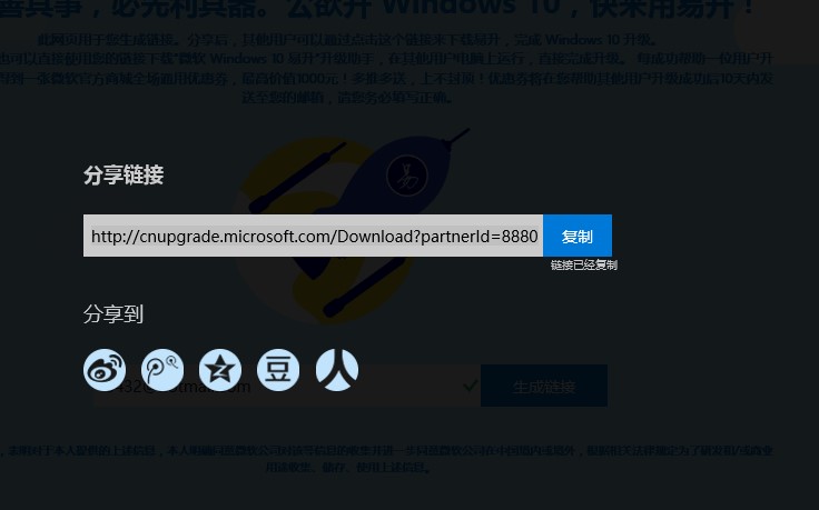 2. 点击“生成链接”,即可生成您的专属链接。这个专属链接,是推荐者的重要证明,只有将这个专属链接发送给朋友,或通过这个专属链接下载的专属“易升”软件成功升级Windows 10后,推荐者和被推荐者才能获得福利,点击“复制”按钮,即可复制该专属链接。