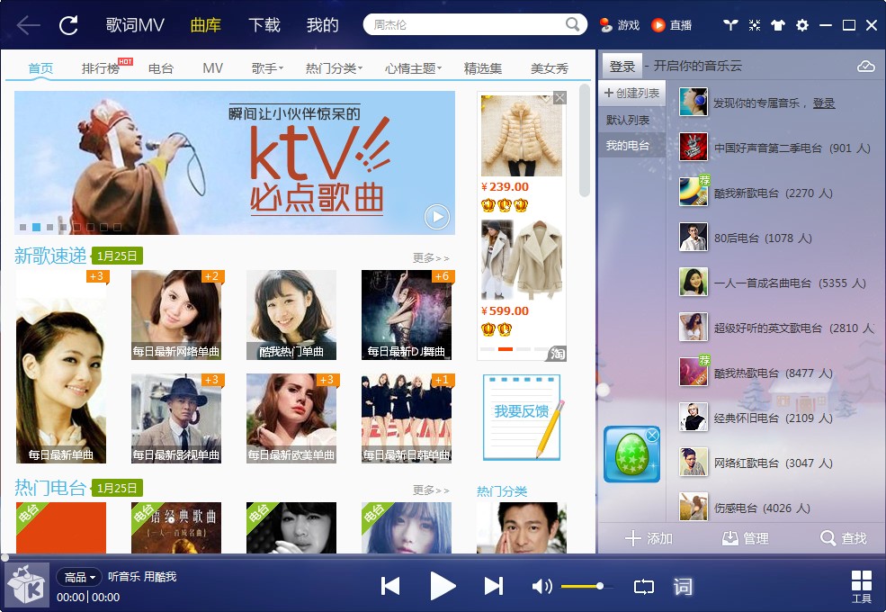 酷我音乐2014是酷我音乐盒出品的最新款音乐播放器,具有界面亲和度高,支持格式广泛,音质好的特点!酷我音乐盒2014整合几百万首歌曲MV,酷我音乐盒2013具备卡拉ok功能和歌词功能!