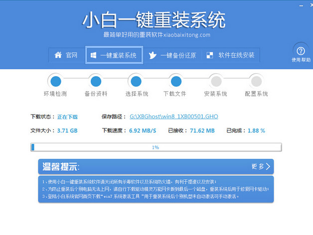 第五步、软件开始下载你所选定的系统Ghost,从界面上可以清晰明了地观察到各种数据。小白系统提供高达10多兆每秒的瞬时下载速度,当然根据每个用户终端的网络带宽不同会有很大差异,请大家在下载过程中耐心等待;