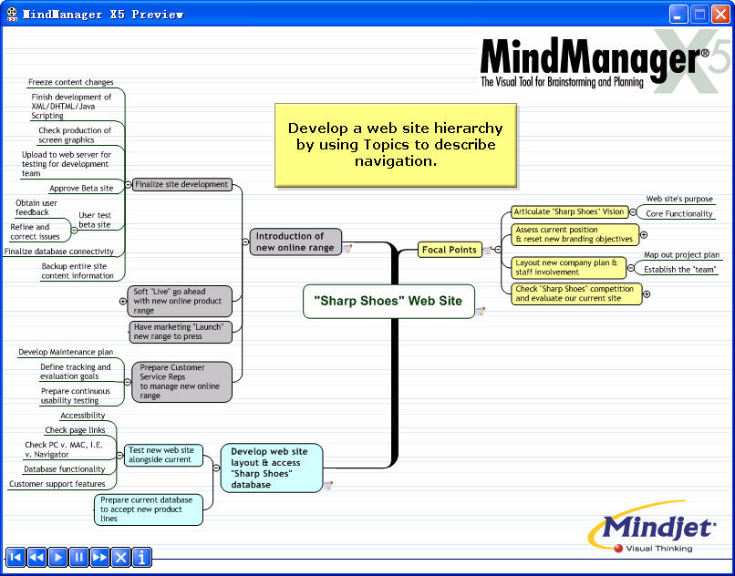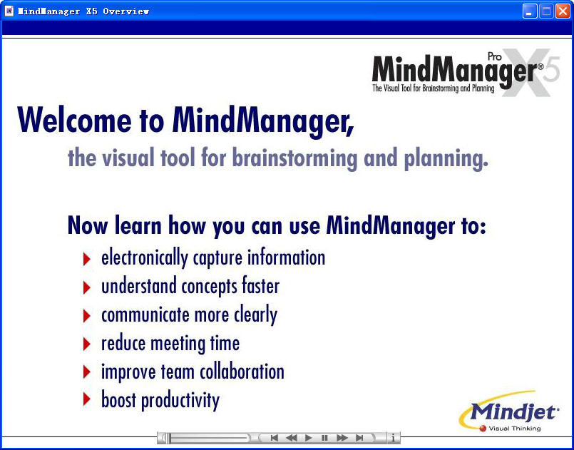 MindManager X5是一个可视化的工具,可以用在脑力风暴(brainstorm)和计划(plan)当中。提供给商务人士一个更有效的、电子化的手段来进行捕捉、组织和联系信息(information)和想法(idea)。 作为便笺(note-pads),挂图(flipcharts)和白板(white boards)的数字化替代品,MindManager提供更快的理解、更好的判断和减少会议时间来提高工作效率。并且MindManager可以和微软的Office系列做到无缝的连接。基于XML的MindManager可以将微软的Office系列同企业数据进行无缝的连接,并能有效的利用好企业的知识。 MindManager X5 Pro能最大限度的帮助商务人士和小组在最少的时间内完成任务。使用这些被证明有效的内容组织方法,能够提高会议效率和加快决策进程。X5 Pro能够和微软Office系列的Word,PowerPoint, Outlook和Project无逢得连成一体,来提高效率和帮助商务项目(projects) 。通过形象的头脑风暴和计划来节约时间,然后将内容导出到专业的网页,图像,PDF文档或者MPX文件类型(注,MPX是Project文件),最终整合到引导项目的管理工具上。 Smart Map Parts,由SmartMapX Technology出品,支持第三方数据源的动态整合,并且包含了搜索结果(search results),其它站点的链接(news feeds)和所有人信息(proprietary information)。 前一版本由于没有时间,有没有地方没有汉化.这个版本针对MindManager的主程序已经基本汉化完成.但是还是有少数地方我找了半边也没有找到在什么地方汉化,希望汉化新世纪的高手们指点一下. 下一阶段将把MindManager的一些例子和宏进行汉化.