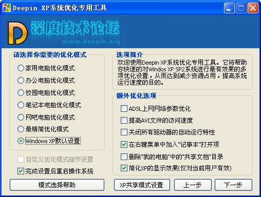 Deepin XP 精简优化设置工具定位于哪些比较偷懒的朋友使用。 这个工具会选择了效果比较明显的优化方式,大多数人只需要选择一下你电脑的使用模式,最多再设置一下服务细节就完成了基本的优化。对已经优化过的系统效果不明显,对新装的系统进行优化效果较好。 这个工具首创对Windows XP系统进行环境模式优化,帮助用户快速进行服务优化而不影响正常使用,同时,能够自动判断内存大小优化系统参数。(对256M以下系统内置特别优化参数),上网痕迹清理、IE故障修复和对XP系统进行快速垃圾文件清理和减肥的功能。