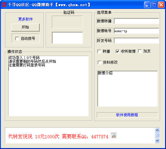 基本功能: 1.批量自动导入号码 2.批量登录号码【需打码】 3.批量收听微博听众 4.批量转播微博广播 5.批量加好友 6.批量修改微博资料