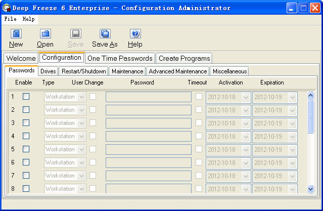 CTRL+ALT+SHIFT+F6呼出DeepFreeze的控制面板,这个时候DeepFreeze会提示你要你输入管理员密码,输入密码后,可以看到所示的控制区。