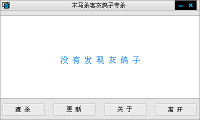 本工具为纯绿色工具,软件采用独特的查杀技巧可完全查杀灰鸽子全系列(VIP2005、vip2006、免杀处理)木马,本软件已经过严格测试,备用本工具可以让您免受灰鸽子木马的困扰.更新内容:软件增加在线更新功能,增加对VIP2006系列及免杀处理的鸽子的查杀,解决对虚拟光驱的误杀问题。v0.5系列可直接在线更新到v0.52版。