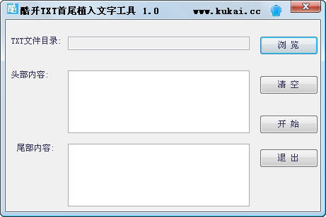 酷开txt首尾植入文字工具使用方法:浏览(选择txt文件所在文件夹路径)--》扫描txt(扫描文件夹中所有的txt文件)---》设置首尾要添加的内容--》开始处理---》成功,完成!