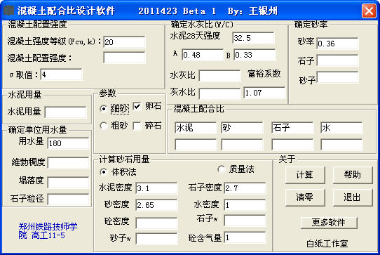 普通混凝土配合比设计软件,根据国家标准规范设计制作。 填写基本数据,即可计算出完整的配合比。