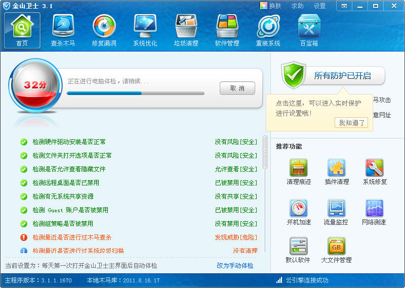 大家好,金山卫士“极速下载版”论坛公测版发布,与普通版本主要差别在于集成了强劲的p2p下载引擎,全面提升了『软件管理』和『漏洞修复』下载速度;下载前,请先阅读以下内容。注1:先卸载已安装版本,再安装金山卫士"极速下载版"覆盖安装会感受不到下载引擎效果。注2:若对公测版有咨询和反馈,请在发帖时标题注明:极速下载版+简述,以便工作人员跟进。版本号:3.1.1.1670 更新日期:2011.8.16 8月16日更新说明:增加了p2sp协议支持,提升了下载速度和下载稳定性;修正了所有已在bug;