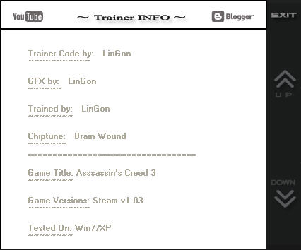 刺客信条3二十项修改器是刺客信条3的游戏修改器。
