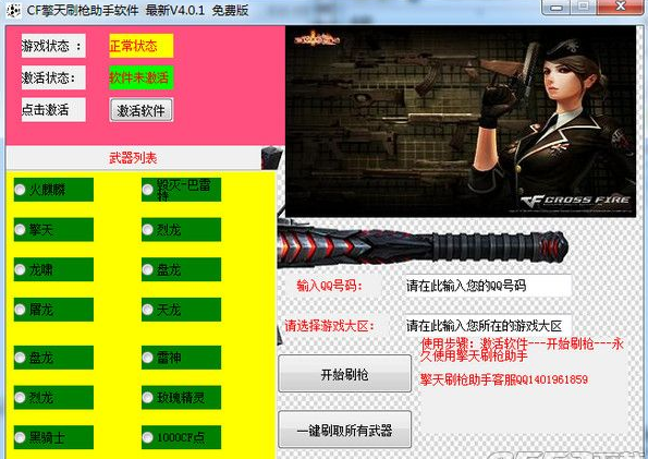 CF擎天刷枪助手软件是一款免费实用的cf游戏刷枪软件,此款软件能够帮助用户刷取火麒麟、黑骑士、雷神、烈龙、龙啸、盘龙等稀有神器。