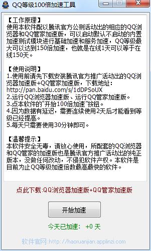 使用本软件配以腾讯官方公测活动出的相应的QQ浏览器和QQ管家加速版,可以启动默认不启动的内置加速测试模块进行基础加速和服务加速,QQ等级最大可以达到150倍加速,也就是在线1天可以等于在线150天。