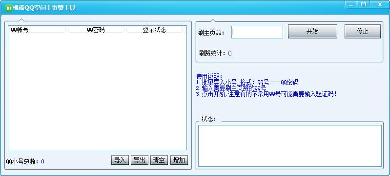 棉被QQ空间主页赞工具由棉被团队推出,它是专门针对QQ空间用户量身打造的空间人气软件,棉被QQ空间主页赞工具可以帮助空间用户批量刷QQ空间主页赞,免除手动操作的繁琐,操作便捷,一键刷赞!支持小号模式,欢迎免费下载使用!