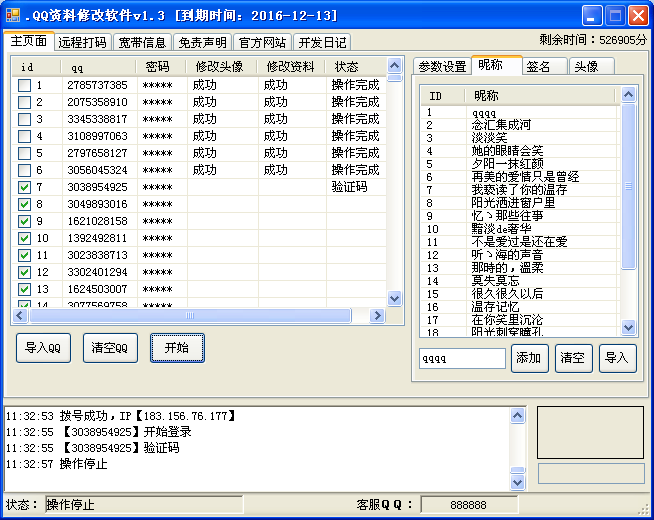 神通QQ资料修改软件是一款专为QQ推广营销人员制作的效率工具,如果你拥有很多QQ小号的话,它便能帮你批量修改QQ资料,免除你手动一个一个修改的烦恼,支持修改QQ头像、性别、年龄、省市地区、昵称、签名等信息,软件可全自动实现打码,换IP操作,欢迎免费下载使用!