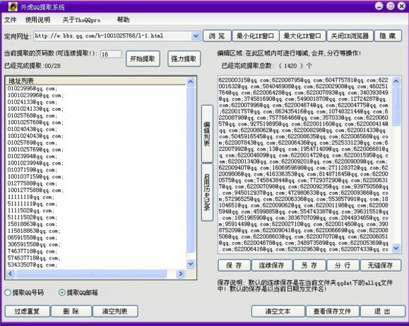 然后点击提取按纽,列表就会出现该热门博客下的所有热门链接地址,然后再点击提取QQ号码或提取QQ邮箱地址,即可出现搜索结果。最后点击去除重复按纽,过虑掉重复的数据,即可进行保存或群发了!
