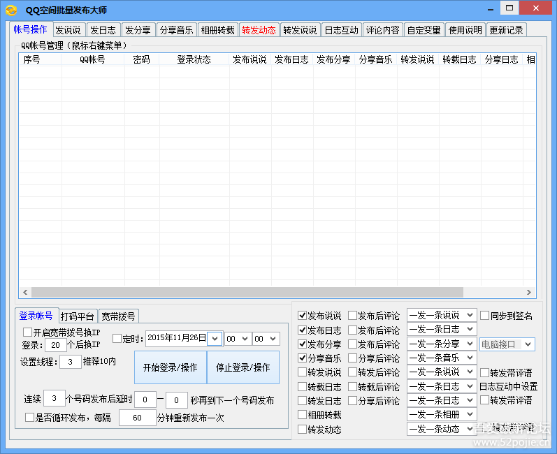 QQ空间批量发布大师是一款2016年最新的QQ空间批量转发评论工具,这款软件可以帮助广大QQ空间用户批量登陆QQ发说说,批量转发日志说说、批量评论、批量分享、带图片转发等等,亲自测试可用,某宝卖几十呢,需要的朋友快来免费下载使用吧!