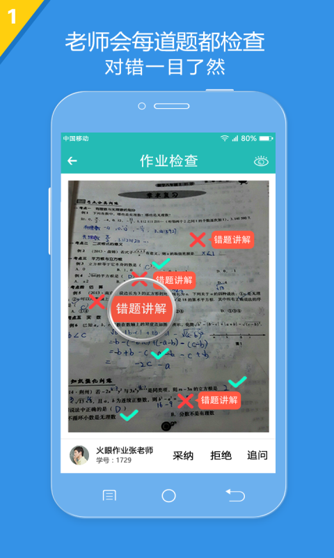 2、老师细致检查讲错:家长拍照后,在线老师15分钟内:每道题都检查(打对打错),每个错题都讲解(相信过程+关键步骤语音思路),每个错误类型都分析(错误类型分析)