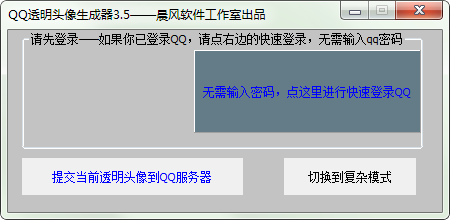 晨风QQ透明头像生成器是一款用来辅助生成超酷的透明QQ头像的工具。传统的方法非常复杂,普通用户难以操作,通过这个工具,只要点一下按钮就生成好了。 QQ透明头像,只要生成一次就可以一直保留,你的好友也可以见到效果。新版本支持克隆其他人的QQ头像,并支持导入导出QQ头像的背景图片