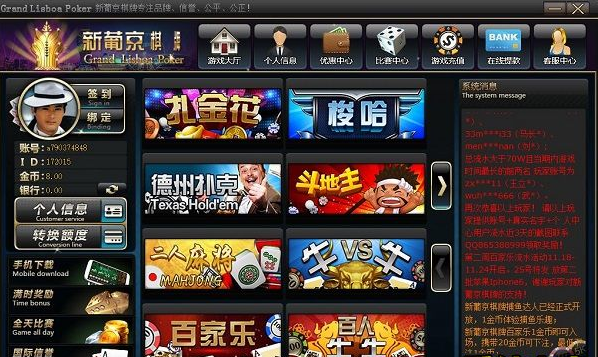 新葡京棋牌游戏平台有多款深受玩家喜爱的棋牌游戏。产品风格美观写实,单机联网均可正常游戏,深受玩家的喜爱,游戏包括了扎金花、梭哈、德州扑克等扑克类游戏,还有二人麻将等麻将类游戏。
