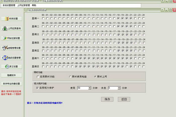 易达学生小孩上网管理软件主要面向学校家庭对学生或小孩使用电脑和上网进行管理,规范学生或小孩的上网行为,家长可以选择一周7天,每天24小时内,限制子女只能在指定时间段内使用计算机,超过使用时间后,电脑将不能再继续使用。