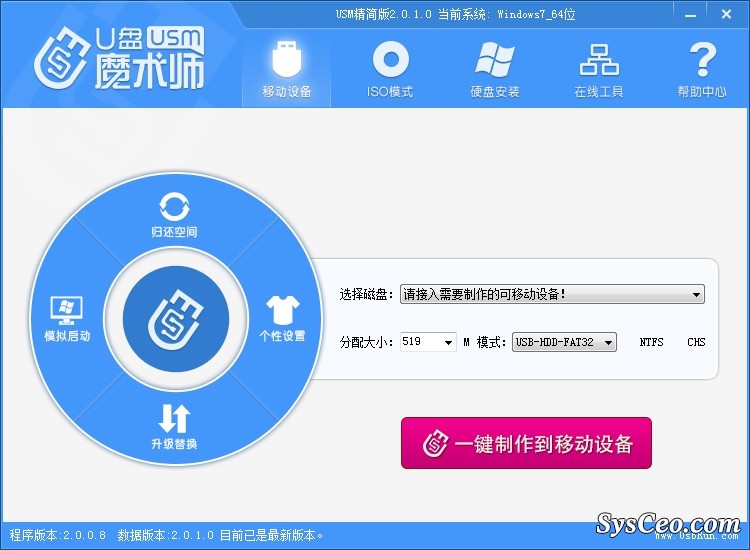 1、移动设备:本页主要是对移动设备PE的UD模式制作,提供的功能有:自动智能扫描并检测当前可用的移动设备、自定义制作参数、自定义PE菜单内容及PE系统壁纸等设置、模拟PE启动界面、归还移动设备空间,升级替换PE、一键全自动制作。