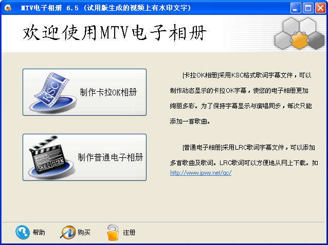 《MTV电子相册》是一款优秀的数码相册制作软件。它能将数码照片转成VCD/SVCD/DVD碟机所支持的格式,功能实用强大,又简单易用,是您家庭制作VCD/DVD电子相册的最佳选择。您可以将所拍摄的数码照片,配上喜爱的背景音乐、卡拉OK歌词字幕、背景图片、片头、片尾和转换特效,刻成光盘后,就可以像播放MTV一样在电视上播放您亲自导演的MTV了。