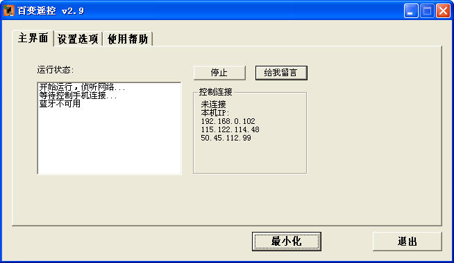 百变遥控电脑端一款超强软件,需要无线网络或者蓝牙的支持,无线鼠标要悲剧了,通过手机遥控电脑的鼠标、键盘。让您的手机变成无线鼠标、无线键盘以及无线重力感应手柄。模拟触控鼠标、键盘、重力感应手柄、多媒体遥控器、PPT遥控。还可以控制电脑锁屏、关机等操作。躺床上看电影时,不用离开温暖的被窝。体验无线重力感应手柄玩游戏的乐趣!