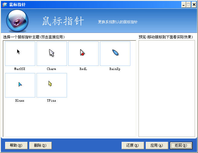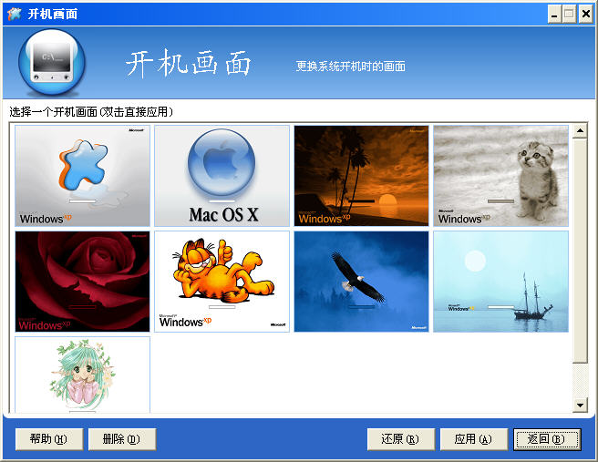 ●软件内置了更多的桌面美化资源,在外观风格、系统图标、开机画面、鼠标指针、登录画面等窗口中都列出了不同风格的主题的相关内容,同时也有相应的效果预览,选择相关内容,双击即可轻松安装,简便易用。