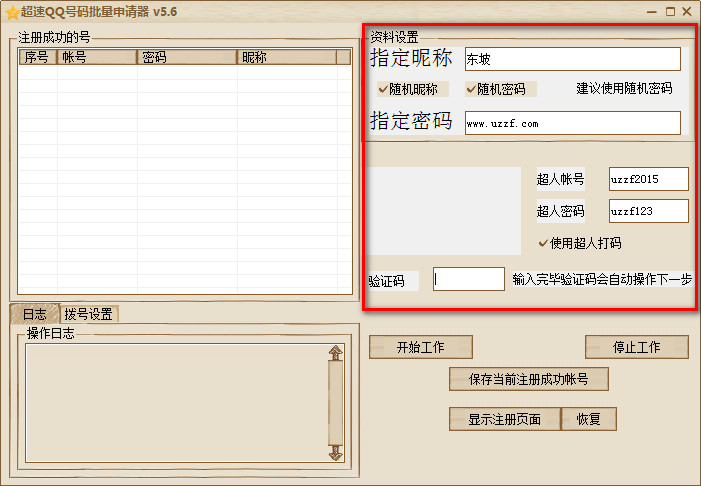 2、设置完成后,单击开始工作,我们可以看到下面的操作日志,还可以看到注册页面的内容上密码已填好。