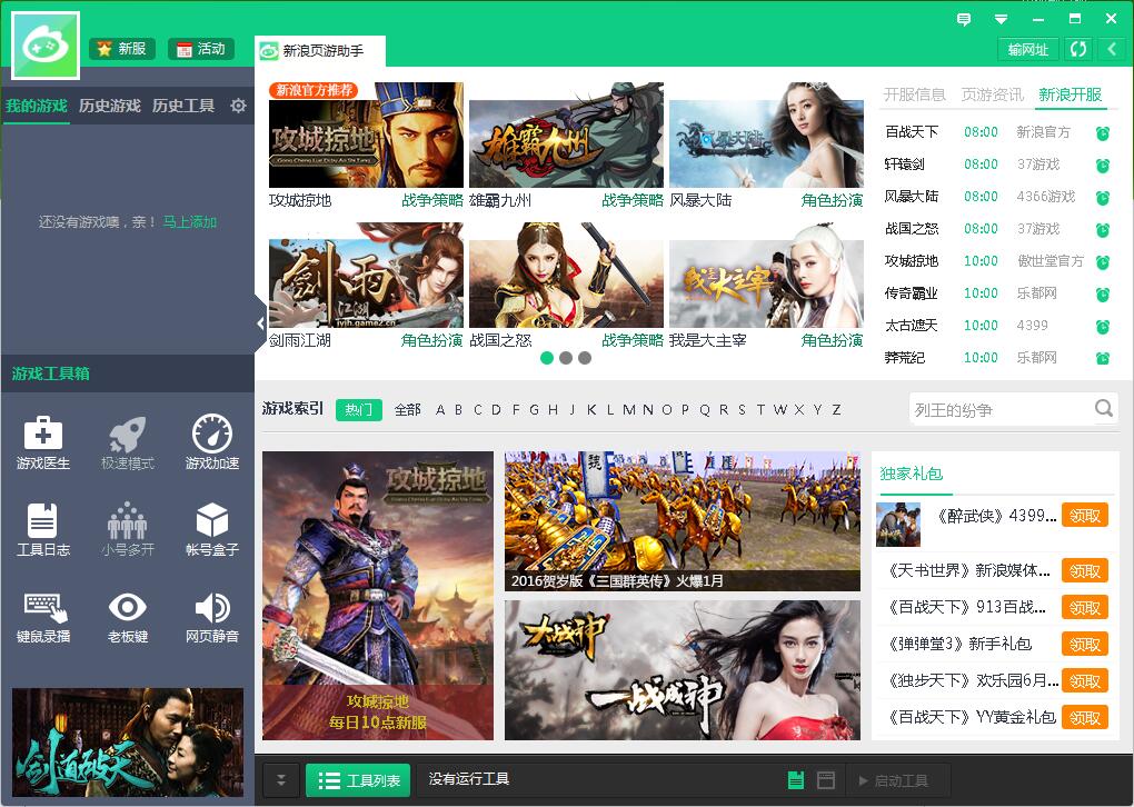 新浪页游助手是页游玩家必备的网页游戏辅助工具。是一款绿色安全的免费精品工具;拥有体积小,安装简单,挂机不掉线,辅助更稳定等特点,升级打怪快人一步!辅助特色功能涵盖市面上热门页游,并且支持多达百家人气页游平台,轻松便捷体验游戏。更是热门游戏独家授权平台。玩游戏还可以赚取积分,在新浪积分商城中换取各种精美的奖品。