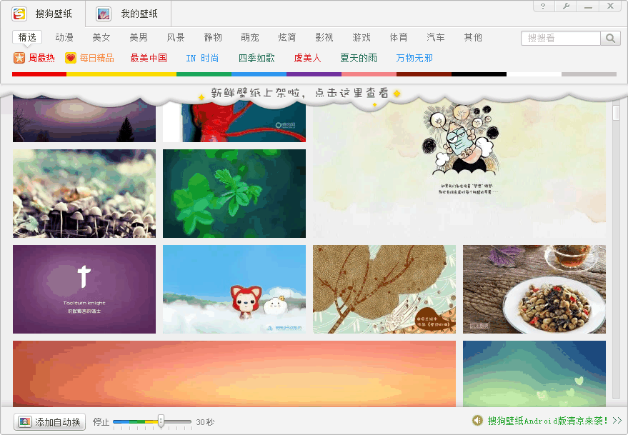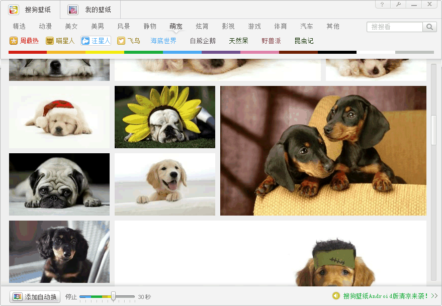 搜狗壁纸是一款高清电脑壁纸下载和自动更换软件,集成万款美女、宠物、风景、电影、节日、日历、简约壁纸,一键更换壁纸,多分辨率自适应,支持分组播放。搜狗壁纸,让你的桌面充满爱!