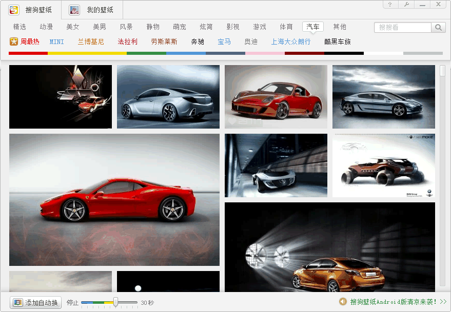 搜狗壁纸,搜狗桌面小组继搜狗输入法、搜狗浏览器后又一给力桌面产品,提供万款高清壁纸下载,自适应屏幕分辨率,点击即可更换壁纸,可设置壁纸自动更换及更换周期。十三大类题材,支持颜色分类,涵盖卡通、风景、美女、帅哥、电影、游戏、汽车、体育等,更有最新最炫的壁纸更新;支持导入本机壁纸,标记“我喜欢”,为你打造桌面专属风格。