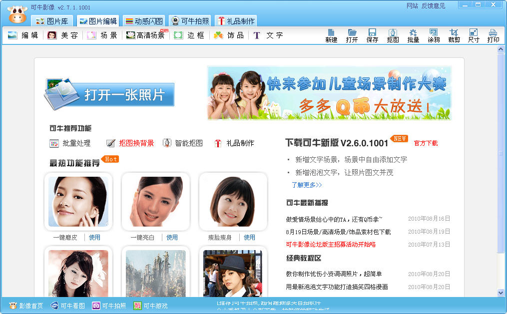 可牛影像是一款完全免费、简单易用的图片处理软件,快速的图片库管理、强大照片美化处理、让您轻松成为数码照片处理专家。数千张精彩场景、非主流可爱饰品、影楼特效等等,告别繁琐的PS,只需1分钟即刻化身成影像明星。