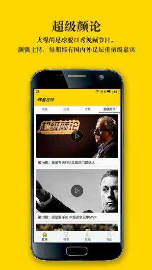 1、超级颜论—中国火爆的互联网足球脱口秀节目。颜强主持,每期均有国内外重量级嘉宾参与足球话题讨论;