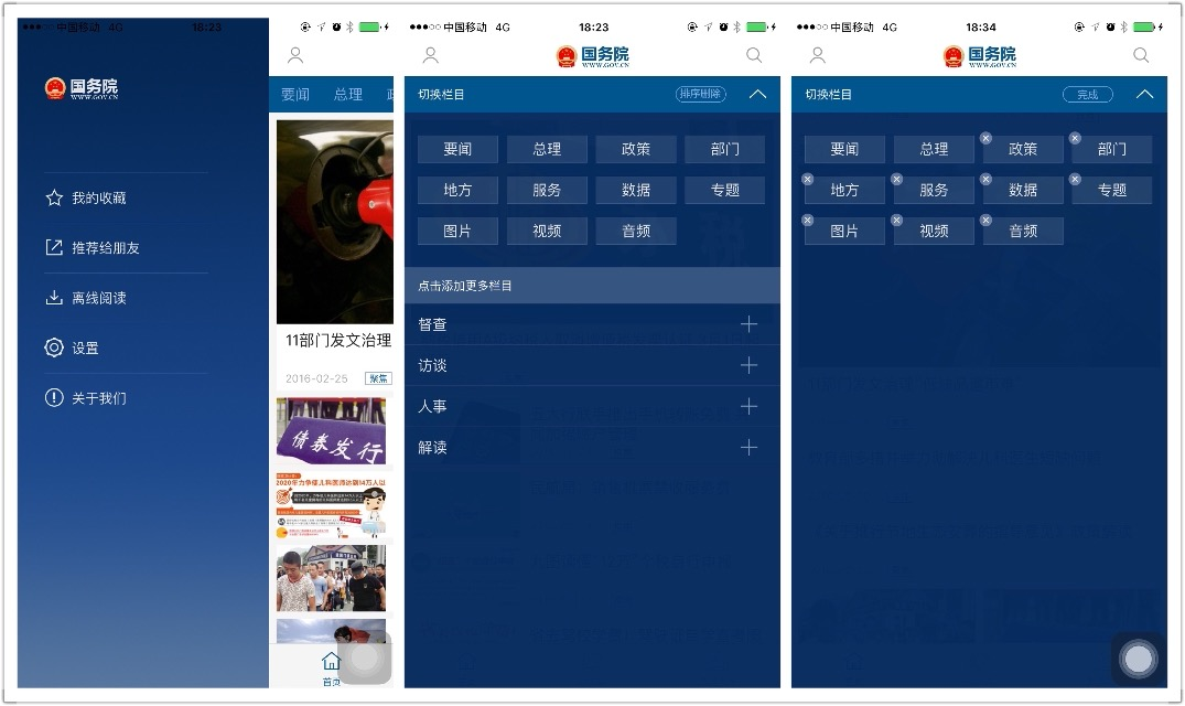 打开App,映入眼帘的是“国务院客户端——你身边的人民政府”字样,顶端包括首页、总理、政策、部门、地方、服务、数据、专题、图片、视频、音频等栏目, 你还可以根据自己的喜好排序、删除或添加某些栏目。