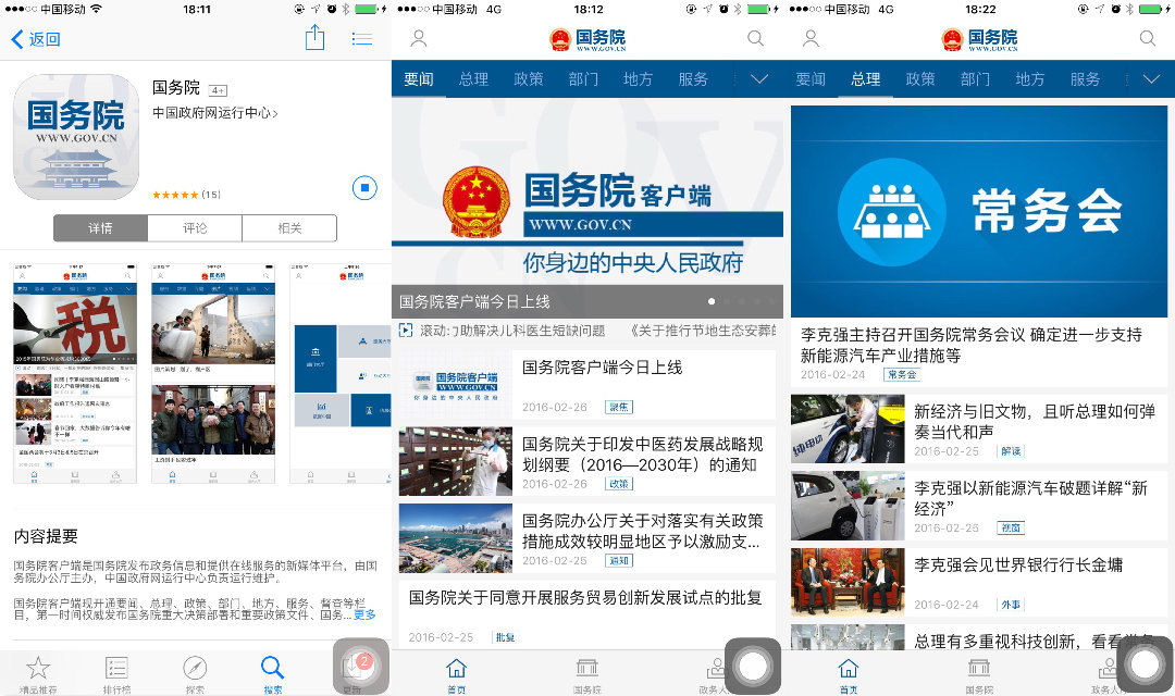 由国务院办公厅开通的微信公众号“中国政府网”推送了一条《国务院客户端今日上线》的新闻。随后,我在App Store里下了一个,海蓝色的主色调严肃而活泼。根据官方介绍,用户通过App Store、360手机助手、百度手机助手、腾讯应用宝等应用商店可下载国务院客户端,只需要输入“国务院”搜索即可。