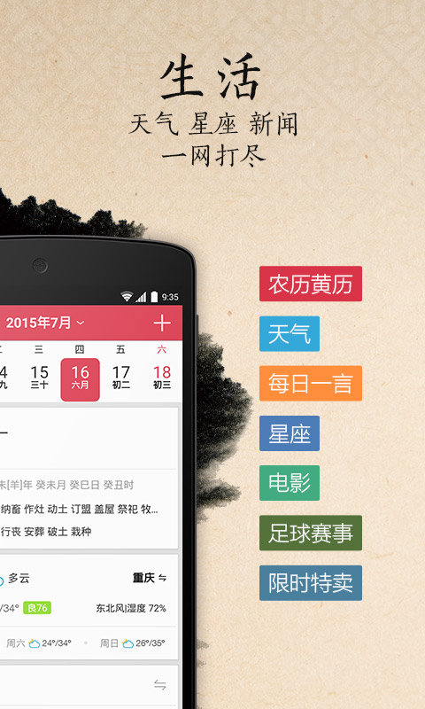 最适合中国人的万年历,集日历、农历、记事、提醒于一身的生活助手。