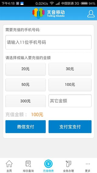 增加了使用联通、移动、电信的全国通用充值卡为天音移动170号码进行充值的功能