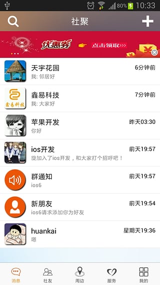社聚app是一款基于地域的社交应用,以社聚来连结社区居民,加强交流协作,促进邻里之间的感情,汇聚社区凝聚力,拥有即时通讯、周边服务、朋友圈与各类折扣功能,是所有社区居民的好帮手。欢迎喜欢的小伙伴来飞翔下载!