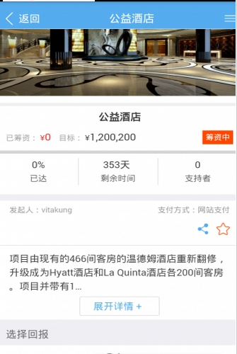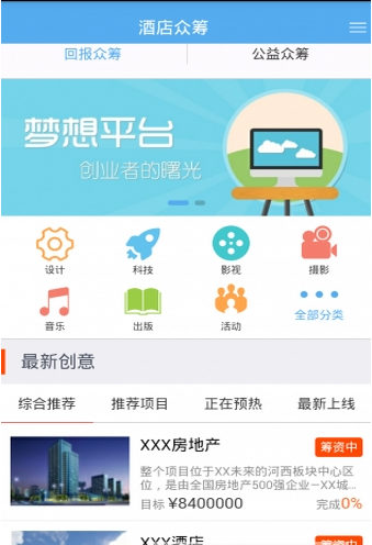 酒店众筹app是专为众筹打造的应用,能随时查看各种优质的酒店众筹项目,了解项目的流程和运转详情,更能和项目发起人在线交流,是您众筹的好帮手。酒店众筹app为项目发起者提供募资、投资、孵化、运营一站式综合众筹服务,我们致力于支持和激励创新,创造性,创意的生活和项目,让创业者获得资金支持和回报我们竭尽全力帮助创意者在众筹中放大自己的价值,借力有效的移动平台,及时了解你的项目关注者和支持者,紧密互动直达梦想圣地!