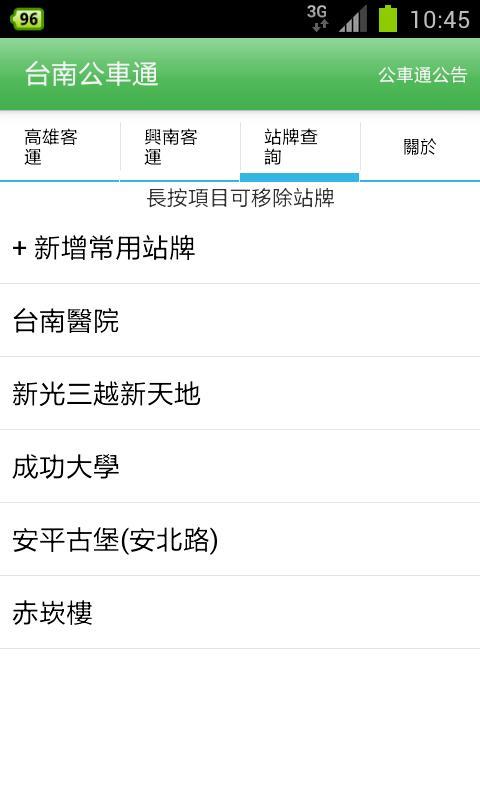 《台南公车通》提供高客南市公车及兴南客运之公车动态查询,具有「路线??动态查询」、「全市快速查询」、「常用站牌查询」、「附近站牌查询」四种查询模式