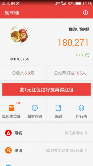 聚享赚app是一款手机娱乐赚钱的应用软件。掌上体验,玩转聚享赚,随时随地做任务赚现金,更有手机游戏、疯狂28 high不停。新用户下载立送现金红包,新人任务带你入门。我们会定期更新各种任务,用户可以持续不断的赚钱。“快速赚钱”、“益智竞猜”、“签到”、“好友奖励”,更有超强红包排位赛,带你轻松月入过万。