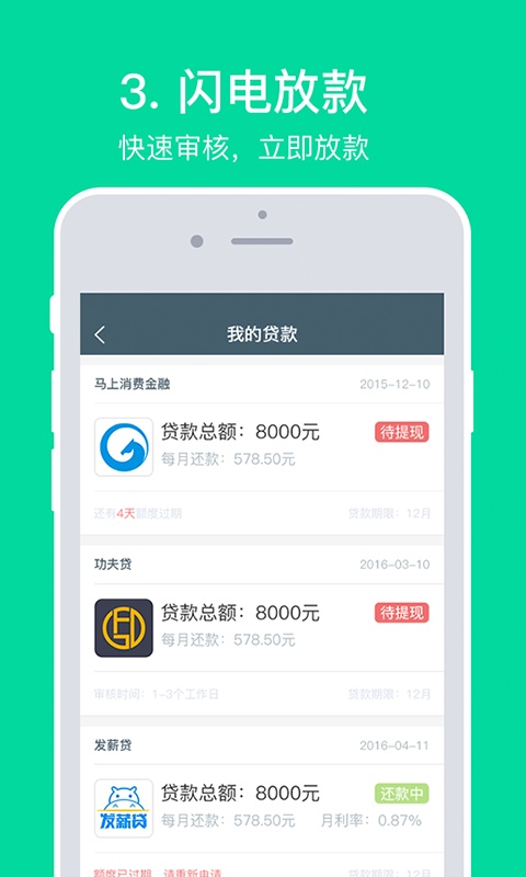 3、闪电放款,快速审核,立即放款;
