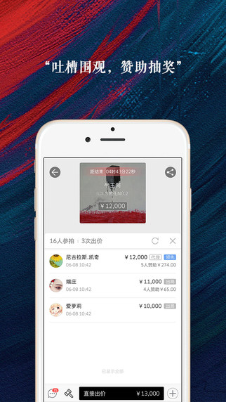艺术赞助/分享给好友邀请一起赞助,赞助金额生成红包,拍卖结束随机分派,助您玩转朋友圈。