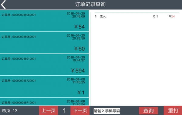 4.可以通过手机号码查询游客消费订单记录。