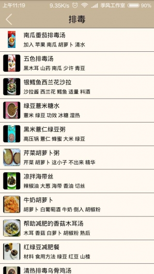当前应用版本提供基本的查询菜单,菜单分类,菜名查询,菜谱列表,展示功能,随后将推出收藏,用户自定义功能。