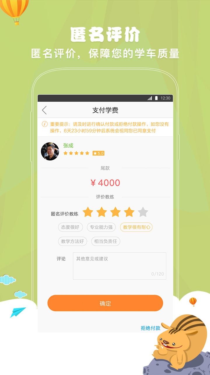 评价教练:学车完成,获取驾照,可对教练作出中肯的评价,评价影响教练评级。