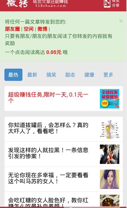 2.通过阅读分享赚提供的搞笑,娱乐,养生,理财,图片,心灵鸡汤知识等内容并分享到自己朋友圈,只要有好友阅读即可获得相应的现金,当现金到达20元是就可以通过支付宝或微信提现了;