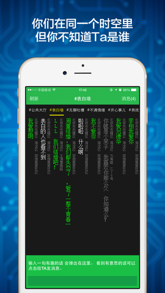 公共大厅、表白墙、无聊吐槽、不满情绪、开心事儿、男找女、女找男,选择你喜欢的聊天室。