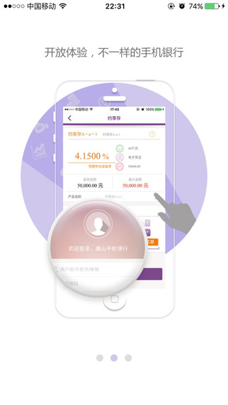 2、开放式体验,不一样的手机银行,唐山银行手机银行不再遵照传统的手机银行使用模式,而是采用金融超市的模式,将所有产品和功能展示出来,让您先对金融服务及产品充分了解;有购买或使用意愿后,再在交易最终确认环节进行安全认证;