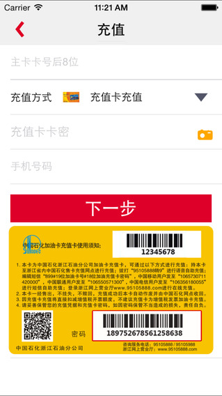 步骤为:业务中心->充值->选择充值卡充值->填写加油卡号,充值卡卡密(可扫描充值卡卡片背面密码区的条形码),您的手机号码->确认充值信息->充值结果回执。